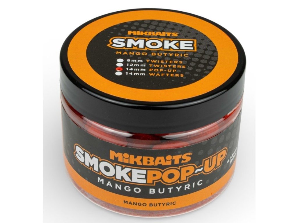 Mikbaits Smoke pop-up Mango Butyric 14mm 150ml - SMOKE pop-up sú nesmierne atraktívne 14 mm plávajúce fluo nástrahy.