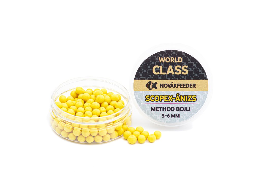 Novák Feeder World Class Method Boilies Scopex-Aníz 5-6mm 15g - nová séria nástrah World Class Method Boilies predstavuje úspešnú kombináciu príchutí pri love na method feeder. Tieto boilies sú úspešné hlavne vtedy keď ryba prijíma veľmi opatrne potravu alebo pri súťažných podmienkach.Balenie obsahuje 2 veľkosti nástrah 5 a 6mm, s ktorými sa vieme okamžite prispôsobiť zmeneným podmienkam v súťažných podmienkach, ale aj pri bežnom rybolove.