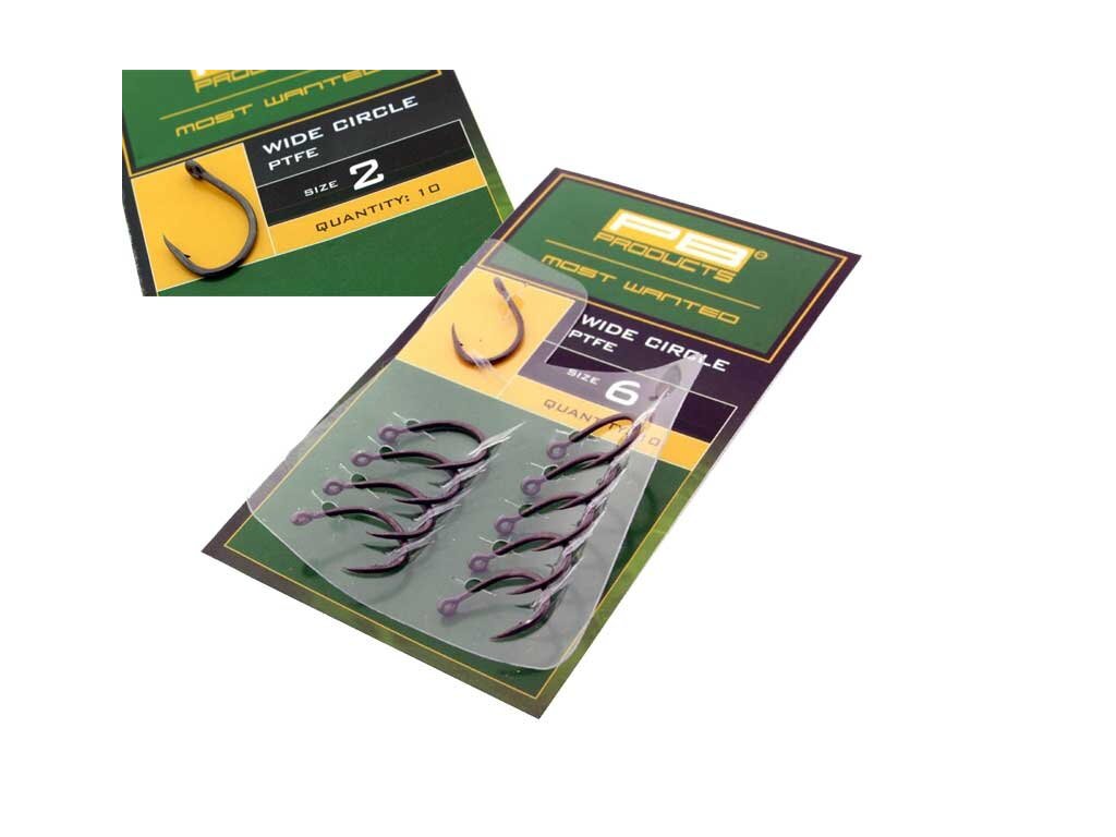 PB Products Wide Circle PTFE vel.2 : Jedinečný model háčika. Háčik s extrémne širokým ohybom a extrémne pevnou krátkou rukoväťou. Tento háčik je ostrý ako žiletka a mimoriadne pevný. To je to, čo hľadáte ako kaprár! Názov vlastne hovorí dosť. Zákruta je takmer taká okrúhla a široká ako dobrý polkruh. Dokonca aj s dlhým zarovnávačom, hrot vyčnieva ďaleko. Wide Circle je tiež mimoriadne pevný vďaka krátkej rukoväti.