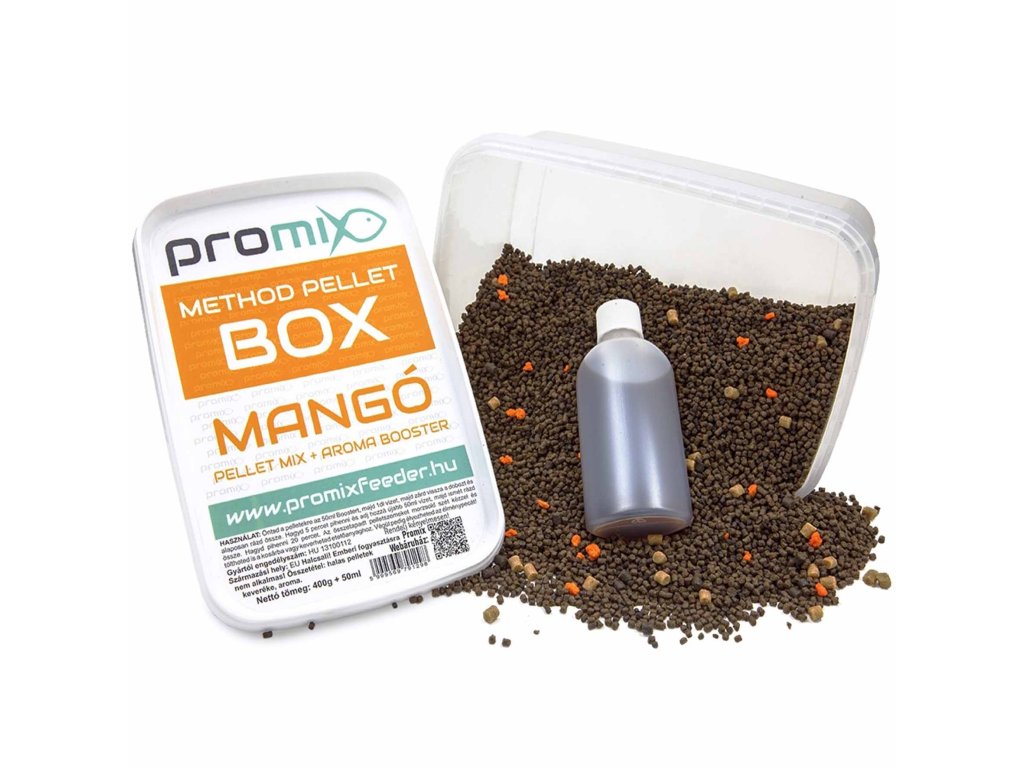 Promix Method Pellet Box MANGO - Zloženie Promix Pellet Box-u je navrhnuté tak, aby bol okrem 38% obsahu bielkovín zachovaný aj čo najvyšší obsah ľahko stráviteľných sacharidov. Vznikla tak komplexná zmes obsahujúca všetky potrebné živiny s vynikajúcim vnútorným obsahom. Obsah bielkovín je okrem najkvalitnejšej rybej múčky doplnený aj prémiové rastlinné bielkoviny, medzi ktorými je najväčší dôraz kladený na bielkoviny z konope a kukuričných klíčkov.Má vysoký obsah vlákniny, čo zaručuje ľahkú stráviteľnosť. Je bohatý na vitamíny a esenciálne oleje. Obsah oleja je predovšetkým z rýb, lososový a tuniakový olej priťahujú ryby ako magnet.
