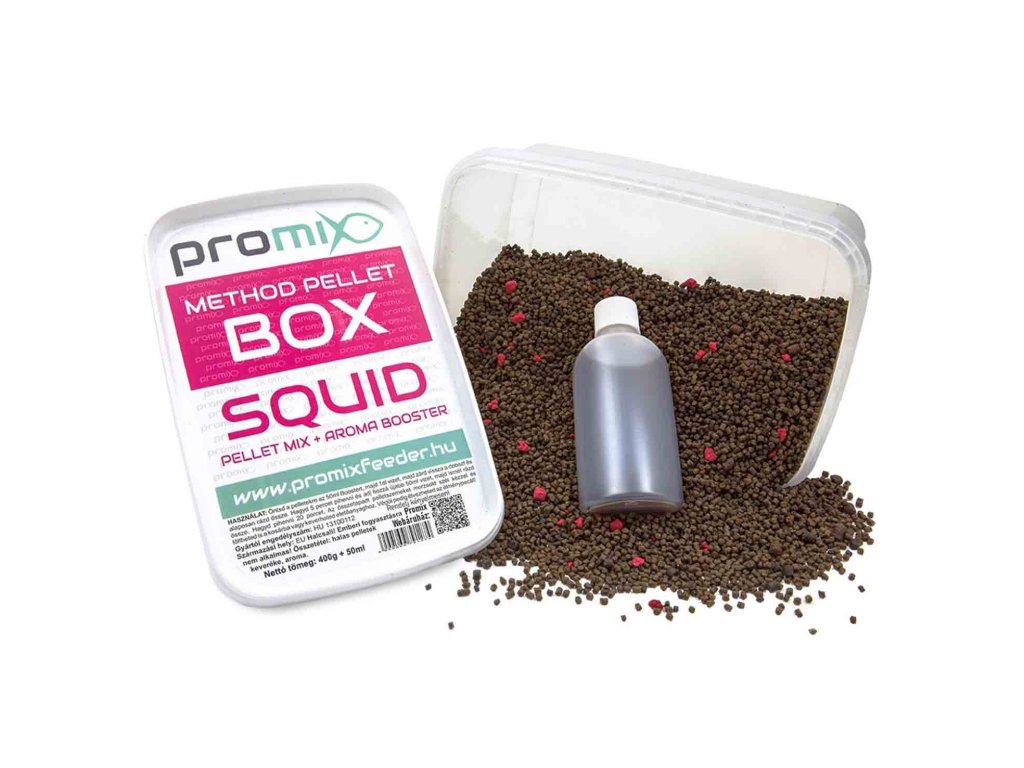 Promix Method Pellet Box SQUID - Zloženie Promix Pellet Box-u je navrhnuté tak, aby bol okrem 38% obsahu bielkovín zachovaný aj čo najvyšší obsah ľahko stráviteľných sacharidov. Vznikla tak komplexná zmes obsahujúca všetky potrebné živiny s vynikajúcim vnútorným obsahom. Obsah bielkovín je okrem najkvalitnejšej rybej múčky doplnený aj prémiové rastlinné bielkoviny, medzi ktorými je najväčší dôraz kladený na bielkoviny z konope a kukuričných klíčkov.Má vysoký obsah vlákniny, čo zaručuje ľahkú stráviteľnosť. Je bohatý na vitamíny a esenciálne oleje. Obsah oleja je predovšetkým z rýb, lososový a tuniakový olej priťahujú ryby ako magnet.