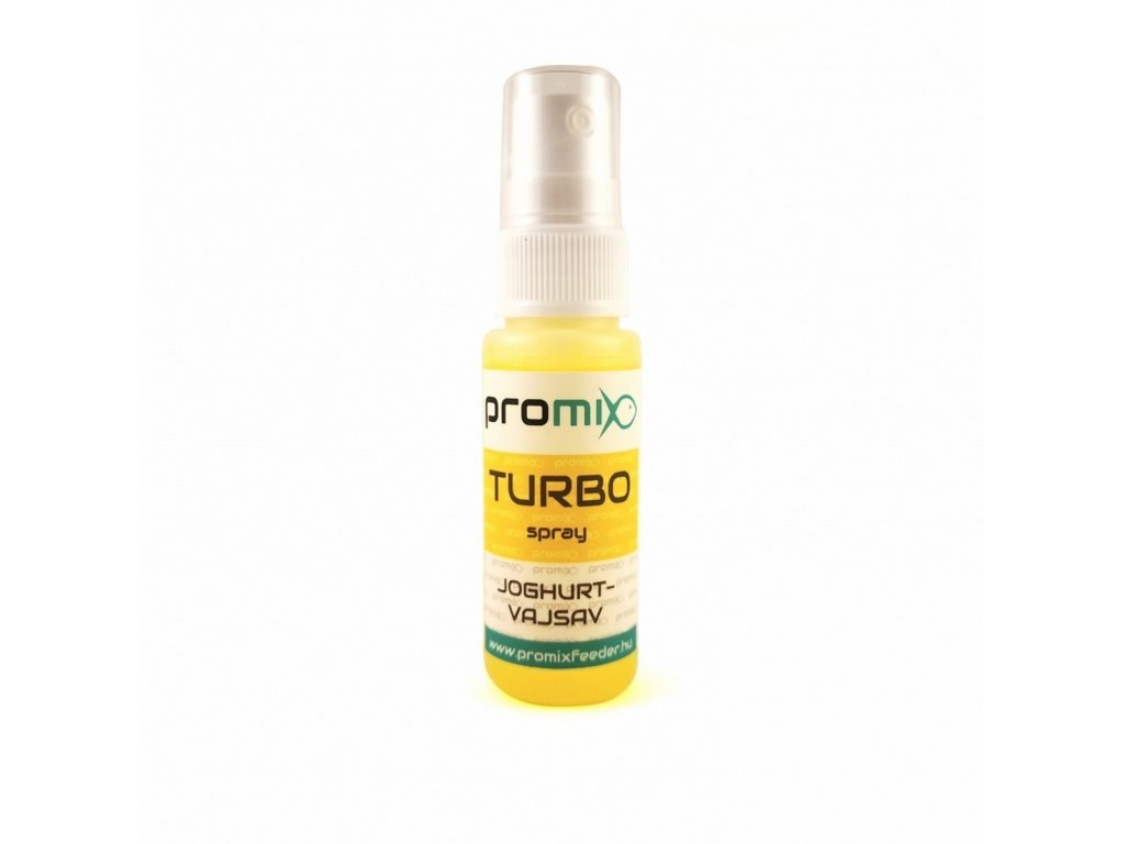 Promix Turbo Spray Jogurt Kyseliná Máslová 30ml - Úloha aróm je pri love kaprov nespochybniteľná, avšak ani tie nie vždy zafungujú, stáva sa, že sú účinné len prírodné arómy. Promix Turbo sprej je riešením tohto problému. Stačí kŕmnu zmes zamiešať bez arómy, potom do naplneného košíka nastriekať zo spreja. S touto metódou vieme vymeniť príchuť aj počas náhodov, ale vieme košík nahodiť aj v natur podobne, ak si to situácia vyžaduje.Často možno sledovať, že sa jednou príchuťou ryby nasýtia, na ňu už viac záberov neprichádza, prípadne pomalšie reagujú na nástrahu. Vtedy zmena arómy môže priniesť úspech. Aká by mohla byť rýchlejšia zmena arómy, ako nastriekať sprej s inou príchuťou na košík?