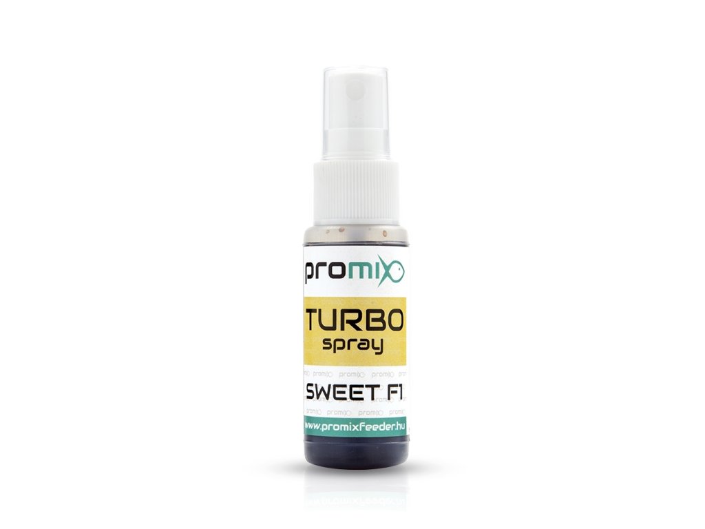 Promix Turbo Spray Sweet F1 30ml - Úloha aróm je pri love kaprov nespochybniteľná, avšak ani tie nie vždy zafungujú, stáva sa, že sú účinné len prírodné arómy. Promix Turbo sprej je riešením tohto problému. Stačí kŕmnu zmes zamiešať bez arómy, potom do naplneného košíka nastriekať zo spreja. S touto metódou vieme vymeniť príchuť aj počas náhodov, ale vieme košík nahodiť aj v natur podobne, ak si to situácia vyžaduje.Často možno sledovať, že sa jednou príchuťou ryby nasýtia, na ňu už viac záberov neprichádza, prípadne pomalšie reagujú na nástrahu. Vtedy zmena arómy môže priniesť úspech. Aká by mohla byť rýchlejšia zmena arómy, ako nastriekať sprej s inou príchuťou na košík?