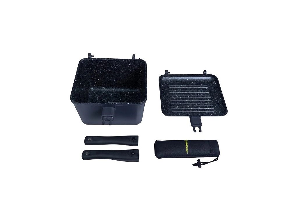 RidgeMonkey Connect Deep Pan & Griddle Granite Edition : Snepriľnavým povrchom GRANITE v štýle žuly robí z tejto outdoorovej panvice úplne profesionálny riad. Panvica Connect Deep je super kompaktná, odľahčená s unikátnym odnímateľným systémom, ktorý premení jednu panvicu na dve – hlboký hrniec a samostatnú panvicu, kedy veko hlbšej panvice je možné použiť ako samostatnú panvičku a môžete variť dve jedlá naraz. Panvica na grilovanie je tiež zameniteľná s sendvičovačom RidgeMonkey Connect Sandwich Toaster Granite Edition.
