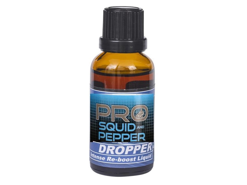 Starbaits Drooper Squid Pepper 30ml - Receptúra špeciálne vyvinutá na čo najrýchlejší prilákanie rýb na kŕmne miesto. Kombinuje vysokú atraktivitu olihňového extraktu a korenistého esenciálneho oleja s výraznou svetlou farbou, ktorá rýchlo zaujme aj apatické a menej aktívne ryby. Dip zvýrazňuje pachovú a chuťovú stopu nástrahy (boilie, partikel, kŕmenie). Nerozpúšťa PVA!