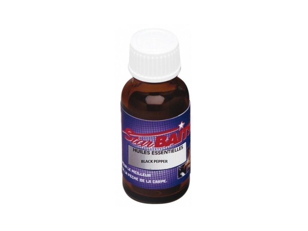 Starbaits Esenciálny Olej Black Pepper 15ml - Produkt známeho francúzskeho kaprárskeho špecialistu firmy Starbaits.Black Pepper je jeden z najlepších atraktorov na veľké kapre!Tento esenciálny olej by nemal chýbať vo výbave žiadneho kaprára, je výborný pre zvýšenie atraktivity ako aj na elimináciu malej ryby. Vhodný pre použitie v teplej aj studenej vode. Stačí jedna kvapka na boilies a môžete chytiť svoju životnú rybu. Samozrejmosťou je jeho použitie pri výrobe boilies alebo dipov.