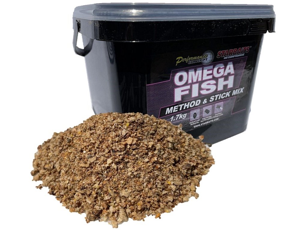 Starbaits Method & Stick Mix Omega Fish 1,7kg : Method Mix nabitý ingredienciami. Nájdete v ňom drvené pelety, prémiový výber drvených a tepelne upravených partiklov, zmes korenia, výťažky z mušlí a morských živočíchov alebo rybie múčky a sladidlá. Jeho zloženie vždy vychádza z danej receptúry príchute boilies Concept. Method Mix je veľmi lepivý a pojme až 30% extra objemu v podobe pridaných peliet, drveného boilie alebo partiklu. Možno použiť aj na prípravu Stick Mixu do PVA. Dodávané v praktickom vedre s vekom.