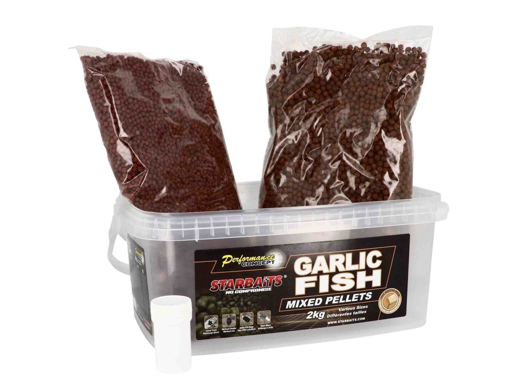 Starbaits Pelety Garlic Fish 2kg mix - Garlic Fish pelety sú vyrobené z prvotriednych výberových múčok. Táto zmes múčok je obohatená o rybacie múčky a cesnakovú aróm, ďalej vysoko atraktívne arómy.