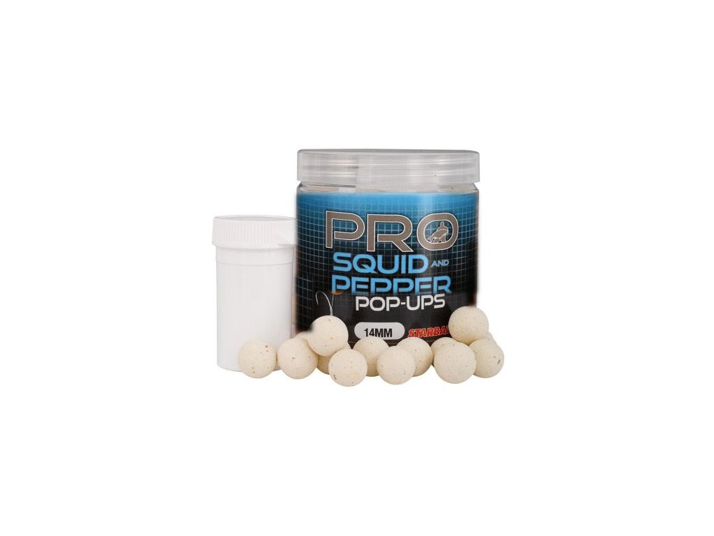 Starbaits Pop Up Probiotic Squid Pepper 14mm 60g : Plávajúce boilies vychádzajúci zo zloženia samotného boilies Pre Squid & Pepper. Je plné prírodných látok, extraktov z kalmára, tekutého výťažku z kalamárov a morských živočíchov doplneného o peprové éterické olej.