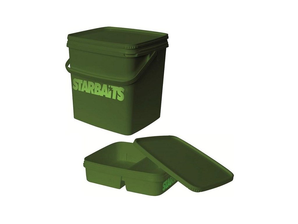 Starbaits vedro Hranaté 11l : Praktické hranaté vedro od firmy Starbaits. Súčasťou setu je veko a miska na odloženie rybárskych drobností alebo na namiešanie krmítkovej zmesi.