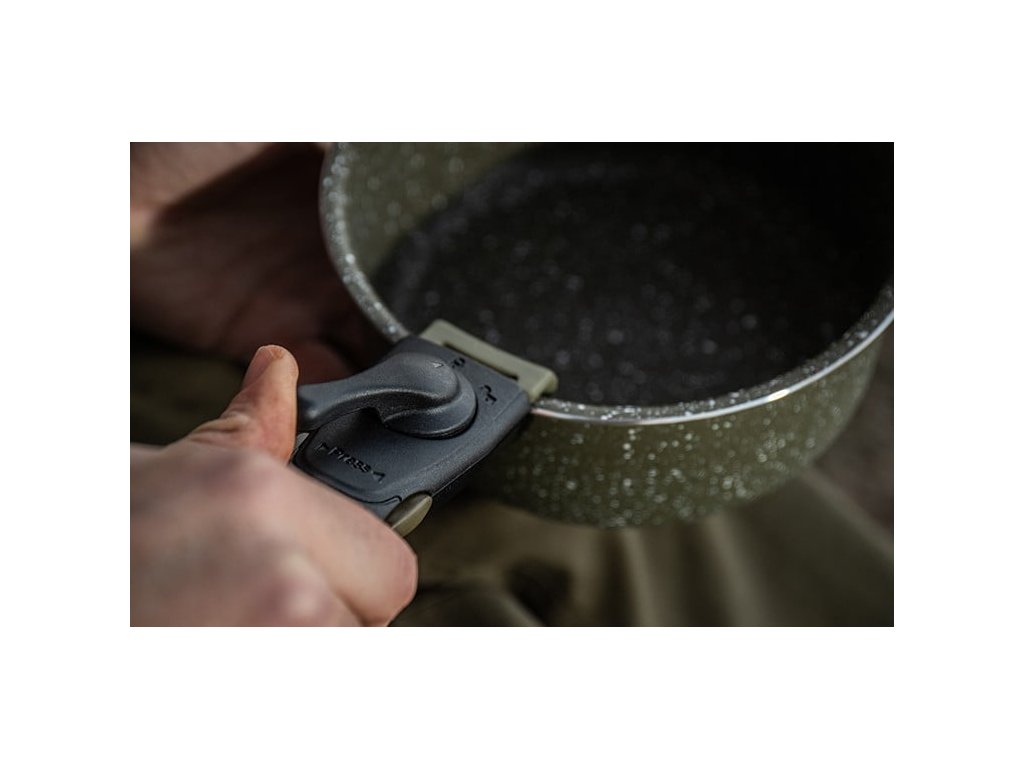 Trakker Armolife Marble Cookset - Medium Sada Nádob - Súprava na varenie Armolife Marble CookSet bola vyvinutá tak, aby bola extrémne odolná proti opotrebeniu. Je vyrobená z extra silného 2,5mm hliníka s nerezovou základňou a potiahnutá dvoma vrstvami mramorového povlaku, ktorý jej dodáva profesionálny vzhľad a dokonale nelepivé vlastnosti. Panvice sú navrhnuté pre všetky zdroje tepla, takže ju využijete ako doma alebo pri vode. Každá sada obsahuje hrniec, panvicu a odnímateľnú rukoväť, ktorá je kompatibilná naprieč medzi sadami. Rukoväť má dvojitú bezpečnostnú západku, ktorá zabraňuje nechcenému uvoľneniu pri manipulácii s horúcou panvicou.
