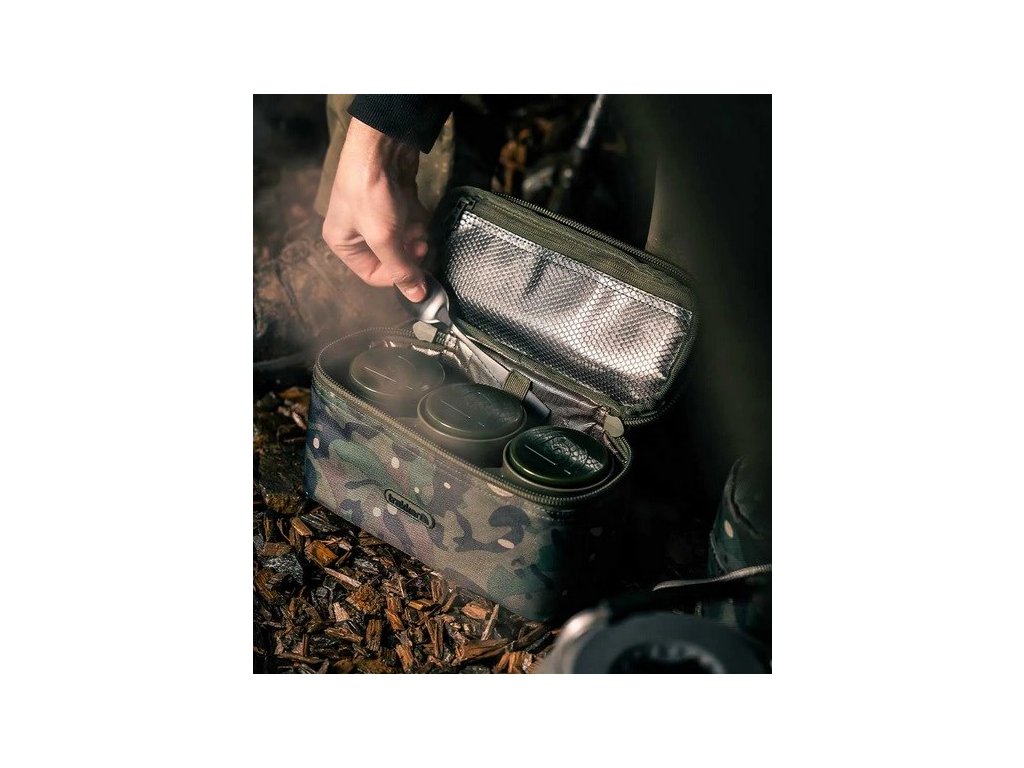 Disponuje vnútorným sieťovaným vreckom na zips na uloženie drobných vecí. Dodáva sa vrátane dvoch plastových hrnčekov, čajovej lyžičky a troch zelených téglikov Glug Pot, ideálnych na čaj, cukor a kávu. Obal je tvorený polstrovanou camo látkou n-dura, odolnými dvojitými zipsami a je doplnený neoprénovou rukoväťou. Vodotesná základňa udrží vaše príslušenstvo na varenie teplých nápojov usporiadané a pripravené na použitie.